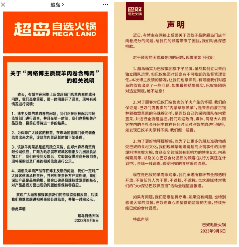 從最初宣稱的巴奴央廚統(tǒng)一配送,到后續(xù)聲明中表示涉事羊肉菜品為獨(dú)立采購,并曬出了廠商“不摻雜其他肉質(zhì)”的承諾聲明……超島店員及官方的不同說辭讓此事疑點(diǎn)重重,也與檢測(cè)機(jī)構(gòu)“檢測(cè)出鴨成分”的報(bào)告數(shù)據(jù)形成矛盾。