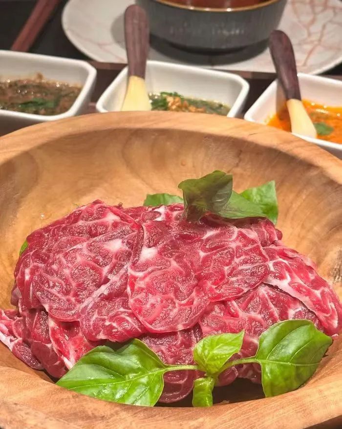 該店餐廳設(shè)計(jì)風(fēng)格圍繞“木”元素,主打高端牛肉火鍋,招牌菜有澳洲巧克力和牛等,有點(diǎn)類似潮汕牛肉火鍋,將牛肉進(jìn)行部位細(xì)分,比如雪花、吊龍、匙柄、五花趾,每上一道菜,都會(huì)有專業(yè)的人介紹牛肉的部位和吃法。
