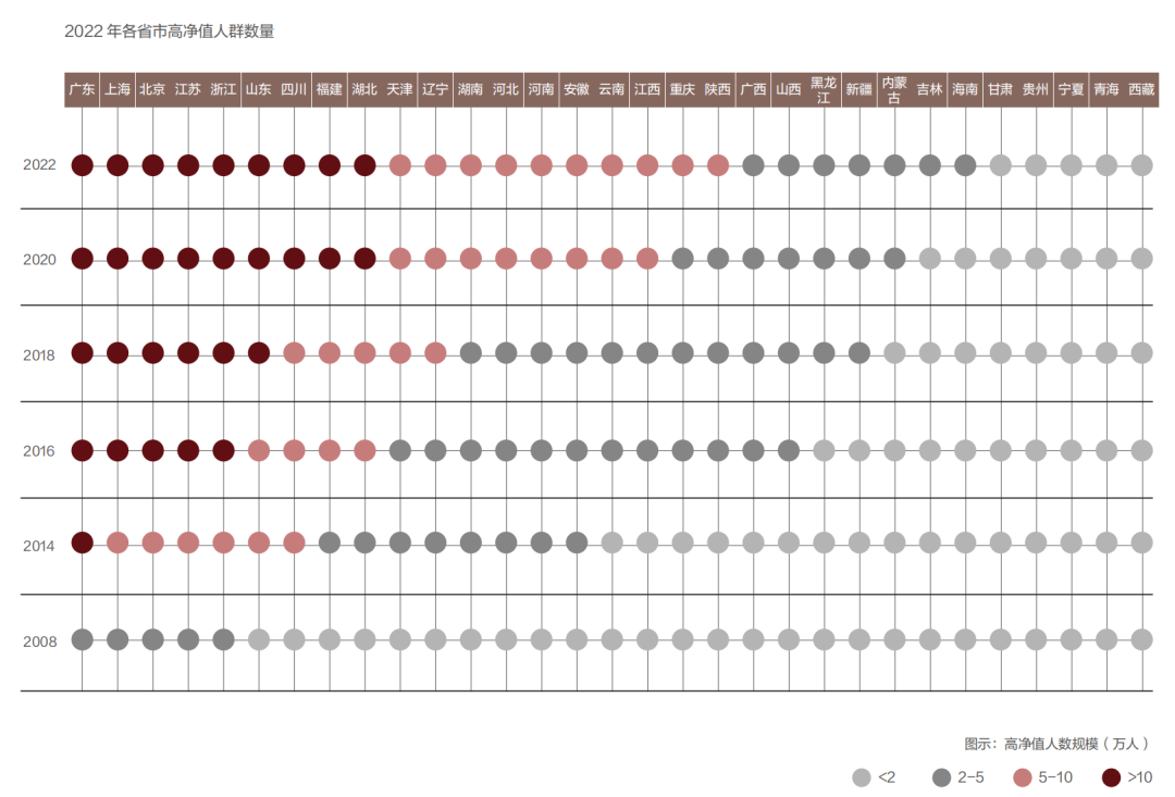 2022年,廣東、上海、北京、江蘇和浙江五個(gè)省市的高凈值人群人數(shù)占全國(guó)總數(shù)比例約為44%;其持有的可投資資產(chǎn)占全國(guó)高凈值人群財(cái)富比重約為60%。