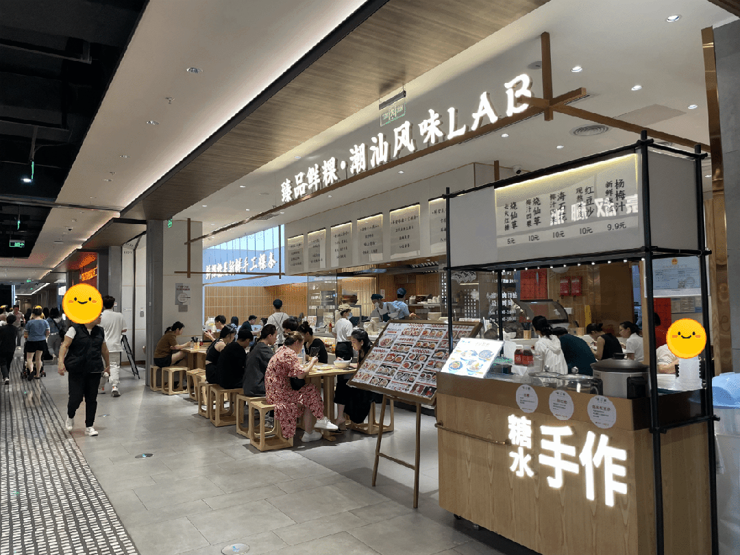 用餐時(shí)間,B2餐飲人流較多,像半藏、臻品鮮粿·潮汕風(fēng)味LAB、敏華冰廳、松鶴樓蘇式湯面、匠本米所等,以及餐飲外擺區(qū)域,人基本都已坐滿,不過(guò)都并未出現(xiàn)排隊(duì)情況。