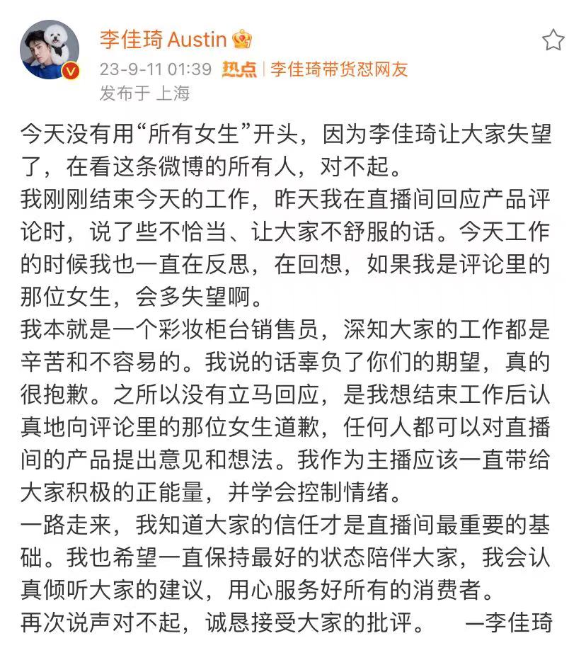 然而,面對(duì)李佳琦的回應(yīng),網(wǎng)友并不買(mǎi)賬,面對(duì)甚囂塵上的網(wǎng)絡(luò)輿論,11日凌晨1點(diǎn)39分,李佳琦在微博進(jìn)行致歉。
