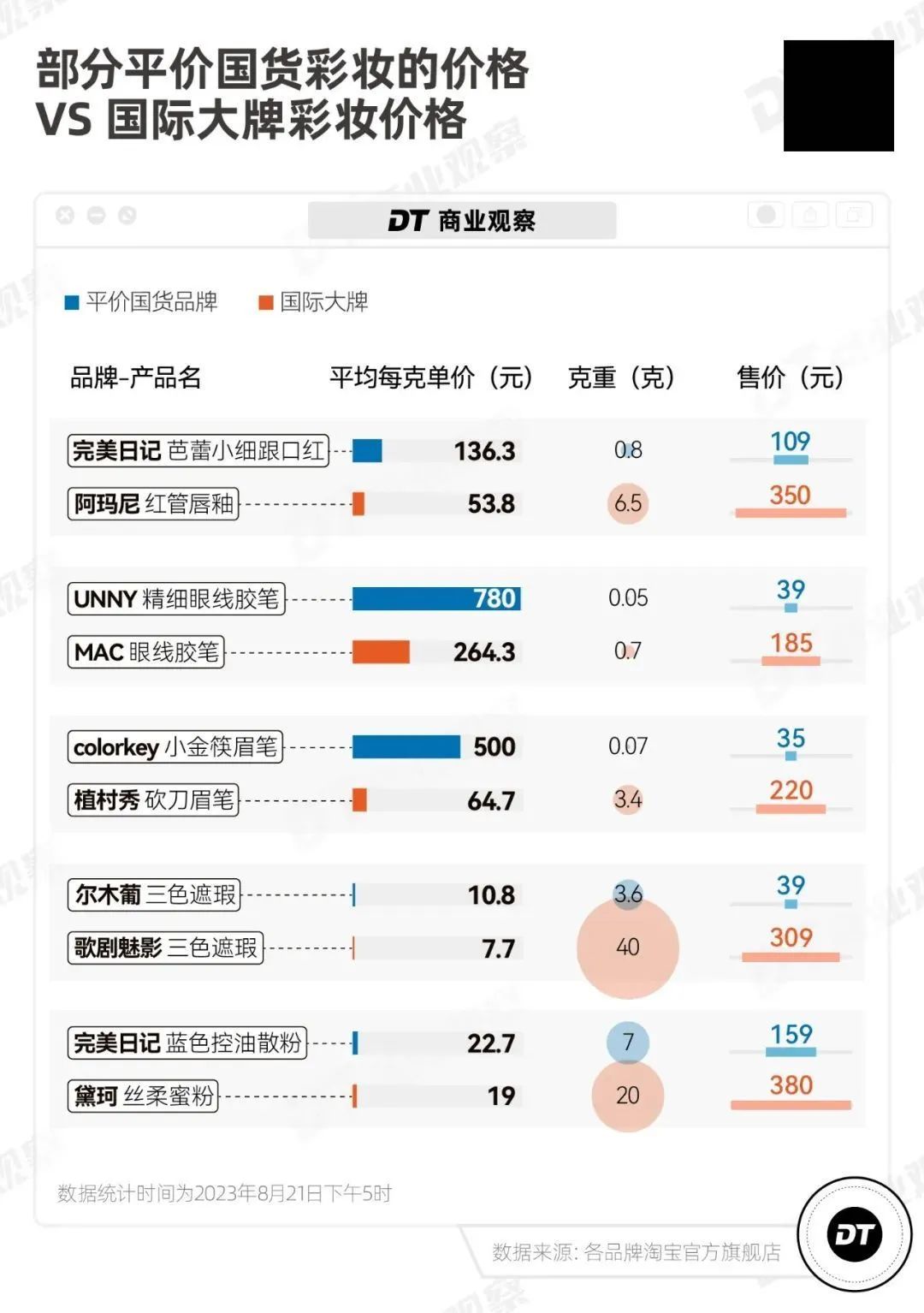 以曾經(jīng)的“國(guó)貨之光”完美日記為例,DT財(cái)經(jīng)發(fā)現(xiàn)完美日記芭蕾小細(xì)跟口紅的單克價(jià)要136.3元,阿瑪尼紅管唇釉的單克價(jià)只要53.8元;colorkey的小金筷眉筆單克價(jià)高達(dá)500元,植村秀的砍刀眉筆單克價(jià)則相對(duì)平價(jià)許多,只要64.7元。