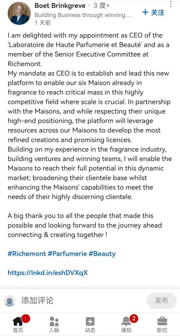 9月7日,Boet Brinkgreve在LinkedIn發(fā)文稱,“我很高興被任命為高級香水與美容部門首席執(zhí)行官以及歷峰集團高級執(zhí)行委員會成員。我將建立并領導這個新平臺,使我們的六個香水品牌在這個競爭激烈、規(guī)模至關重要的領域達到最高質量。在尊重其獨特高端定位的同時,將利用我們旗下品牌的資源,開發(fā)最精致的產(chǎn)品和最有前景的授權證書。”