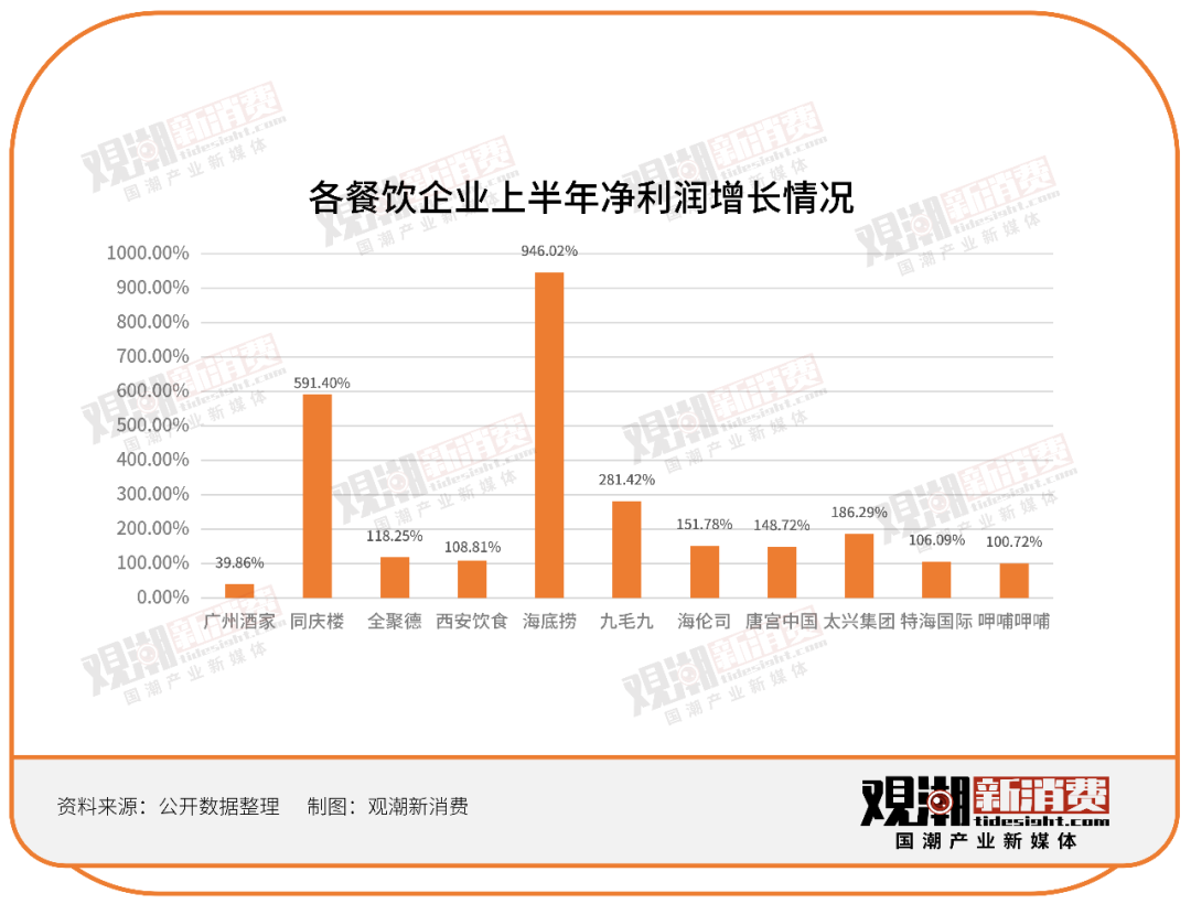 在這11家餐企中,海底撈、太興集團(tuán)、海倫司、唐宮中國(guó)、全聚德和特海國(guó)際均實(shí)現(xiàn)扭虧為盈,凈利大幅增長(zhǎng)。其中海底撈的增長(zhǎng)幅度最為明顯,從去年同期的-2.66億元成長(zhǎng)至今年上半年的22.58億元,營(yíng)收也增長(zhǎng)至188億元,較上年同期增幅超過23.7%。這也是海底撈自2018年上市以來交出的最好成績(jī)單,其年中業(yè)績(jī)最高時(shí)——2019年上半年,歸母凈利潤(rùn)也僅9.11億元,還不及今年上半年的一半。