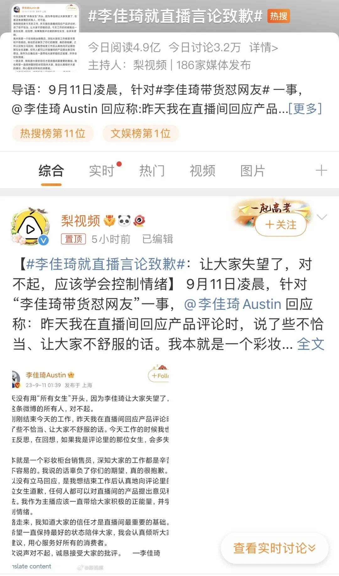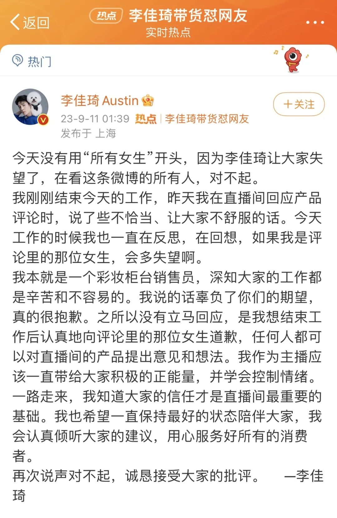 受到輿論反噬后,9月11日凌晨,李佳琦在個人微博公開致歉,稱“讓大家失望了,在看這條微博的所有人,對不起!