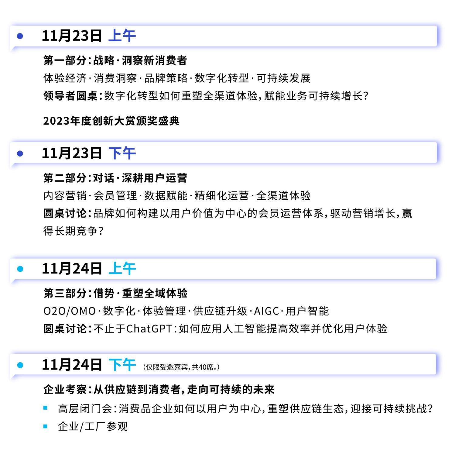 兩天峰會(huì)涵蓋3大主題論壇、年度創(chuàng)新大賞頒獎(jiǎng)盛典、2場(chǎng)圓桌對(duì)話、1場(chǎng)企業(yè)考察、品牌體驗(yàn)劇場(chǎng)、先鋒科技路演等多項(xiàng)活動(dòng),以期為您創(chuàng)造多樣化且有價(jià)值的學(xué)習(xí)平臺(tái)與社交場(chǎng)合。
