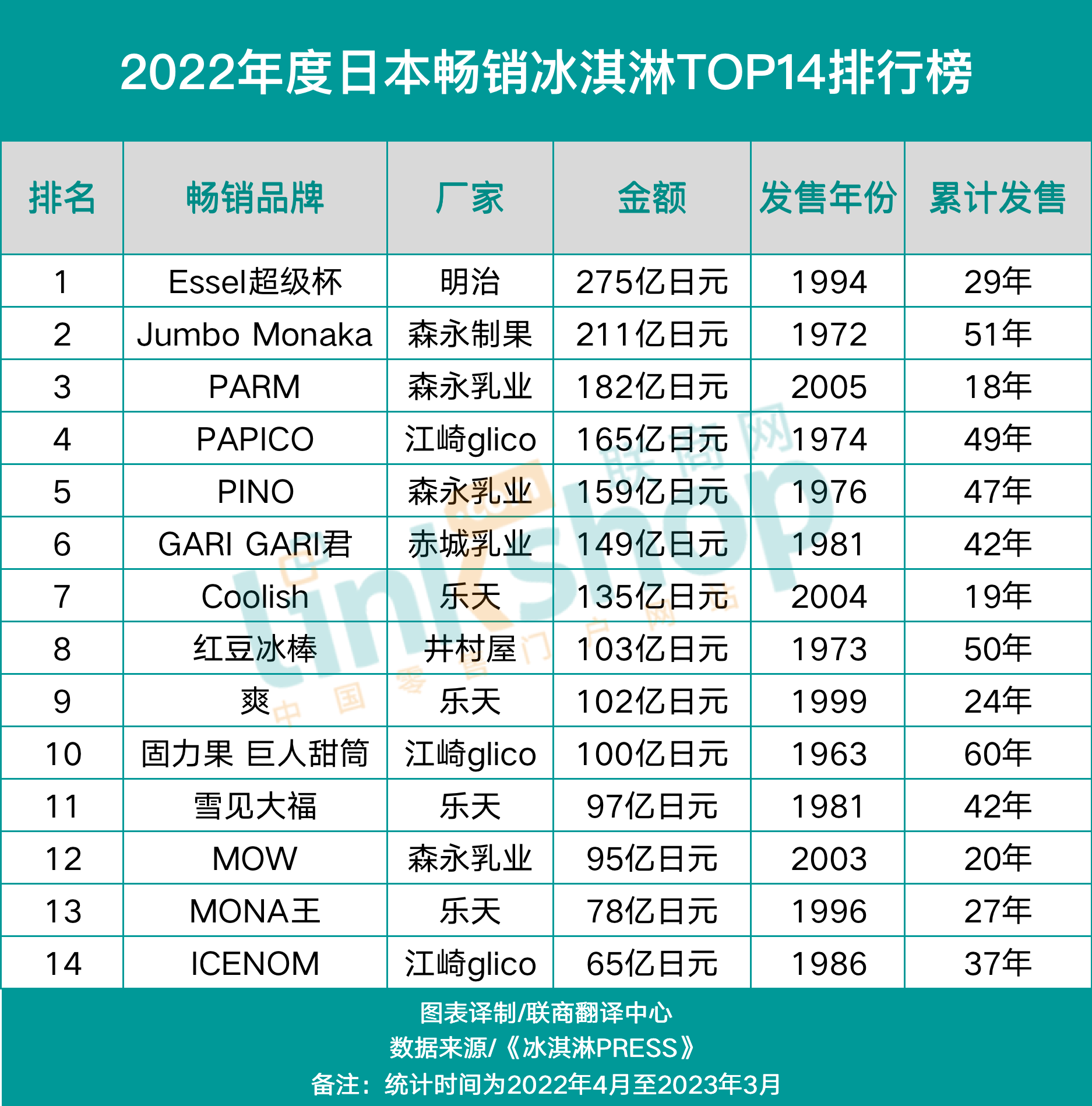 首先請(qǐng)看下面的表格。這是冰淇淋業(yè)界的專業(yè)媒體《冰淇淋press》做出的2022年度暢銷排行榜。從中可見,10種人氣冰淇淋的平均銷售年限超過38.9年。