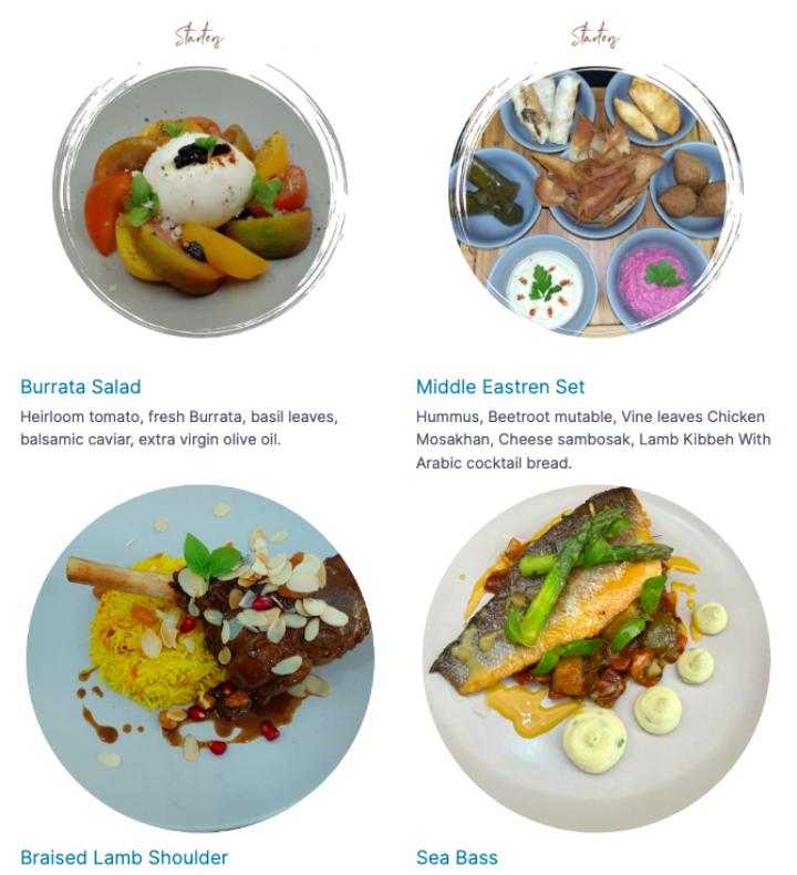以一頓正餐舉例,空中餐廳提供前菜、主菜、甜點(diǎn)和酒水可供顧客選擇,不同國家的空中餐廳也會(huì)結(jié)合當(dāng)?shù)靥厣贫ú似。例如位于迪拜的空中餐廳,主要制作中東特色為主的創(chuàng)意菜品,前菜提供布拉塔沙拉,搭配魚子醬等,主菜包括紅燜羊肉、香煎鱸魚、雞肉等,并提供一些特色醬料,餐后甜點(diǎn)為巧克力蛋糕、意大利奶凍等。