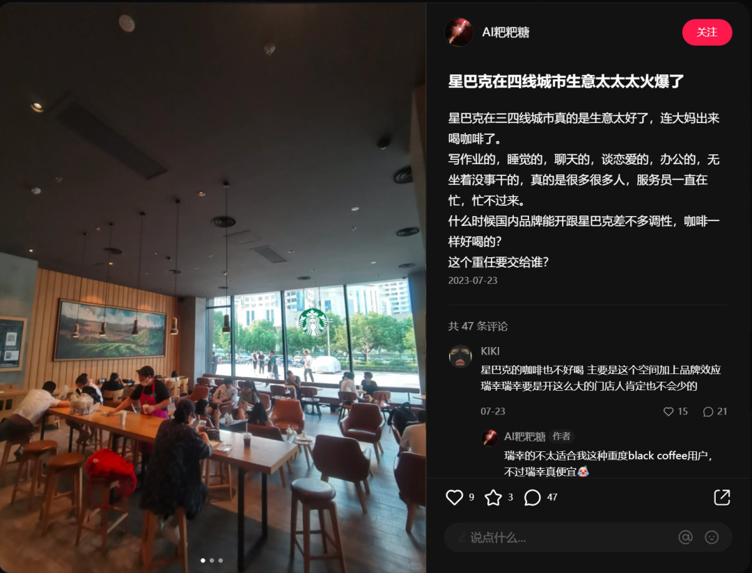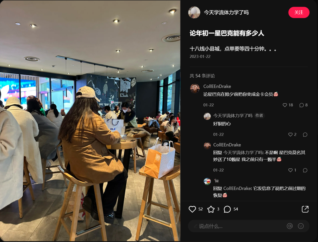 也有許多網(wǎng)友曬出圖片,自己所在縣城的星巴克,全是人。
