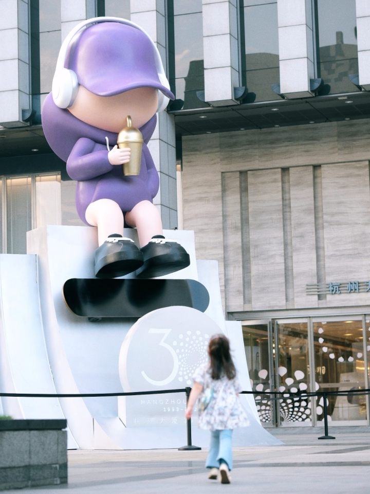30周年之際,杭州大廈特別邀請(qǐng)了法國(guó)藝術(shù)家Leo & Steph原創(chuàng)的潮流IP:KID CUP,一個(gè)沒有五官、拿著吸管杯的中性角色,推出KID CUP華東首展,以年輕潮流視角,表達(dá)不變的初心。