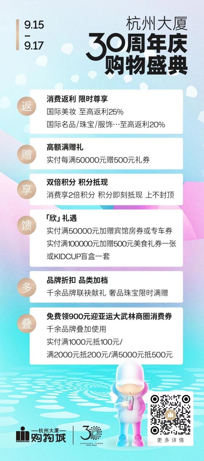 9月15-17日,是杭州大廈30歲生日的“正日子”,30周年慶購(gòu)物盛典將在這3天里精彩呈現(xiàn)。屆時(shí),商場(chǎng)全樓全館千余品牌將聯(lián)袂送上生日大禮,就等著“新老朋友”們來(lái)聚一聚,開開心心地瀟灑“購(gòu)”一回。