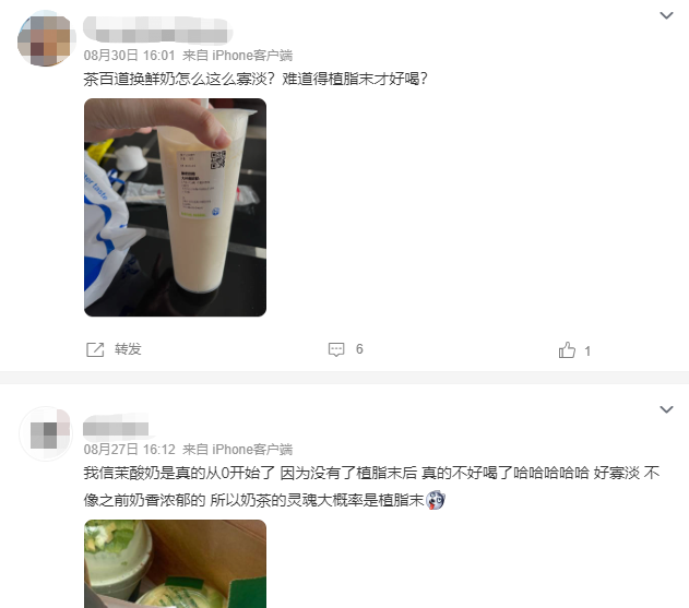 作為一個(gè)有喝奶茶習(xí)慣的人,我沒有留心過工藝,也不是很在意原料,但是奶茶味道越來越淡,我還是能嘗出來的。懷著一個(gè)新媒體人的敏感,我上社交平臺(tái)搜了搜,發(fā)現(xiàn)我果然不是一個(gè)人,近期諸如“鮮奶茶都好淡”“xx牌子的奶茶怎么越來越?jīng)]味道”的帖子實(shí)在很多。