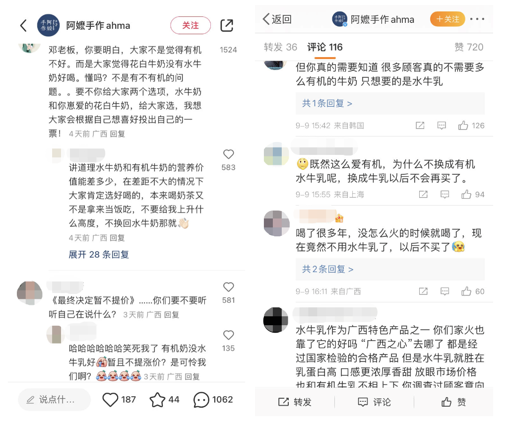 對(duì)于換奶,阿嬤手作感性地自白:“這或許是阿嬤做過最‘笨’的決定!睆脑u(píng)論區(qū)來看,似乎一語成讖,消費(fèi)者們紛紛表示:水牛奶,好喝愛喝,有機(jī)奶,大可不必。