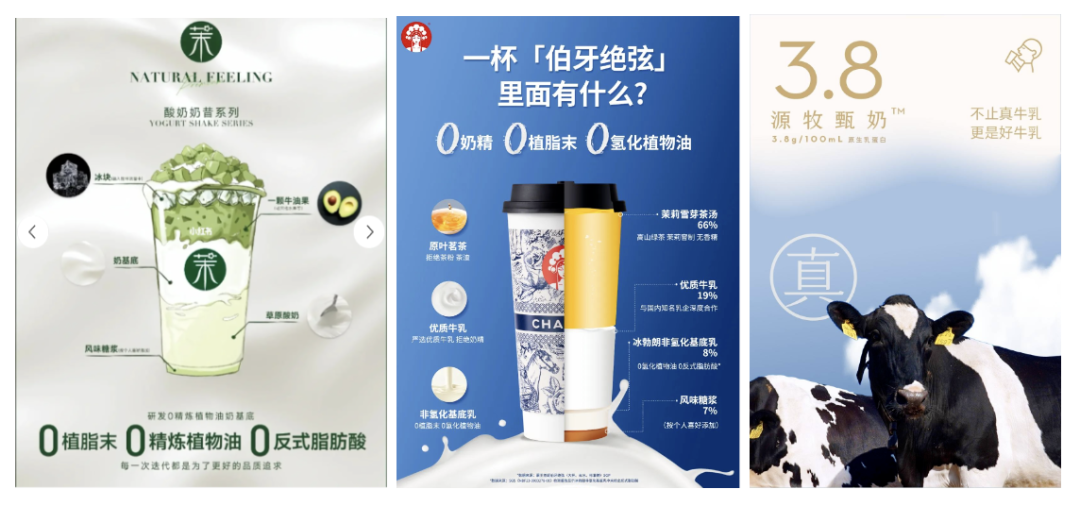 水牛奶,以及更強(qiáng)調(diào)健康的植物基奶底如椰奶、燕麥奶,都在茶飲無限內(nèi)卷的路上分到了一杯羹,而現(xiàn)在,真、純、鮮的奶,成為了新故事的主角,站到了各大品牌交戰(zhàn)的中心,植脂末則被避之唯恐不及。