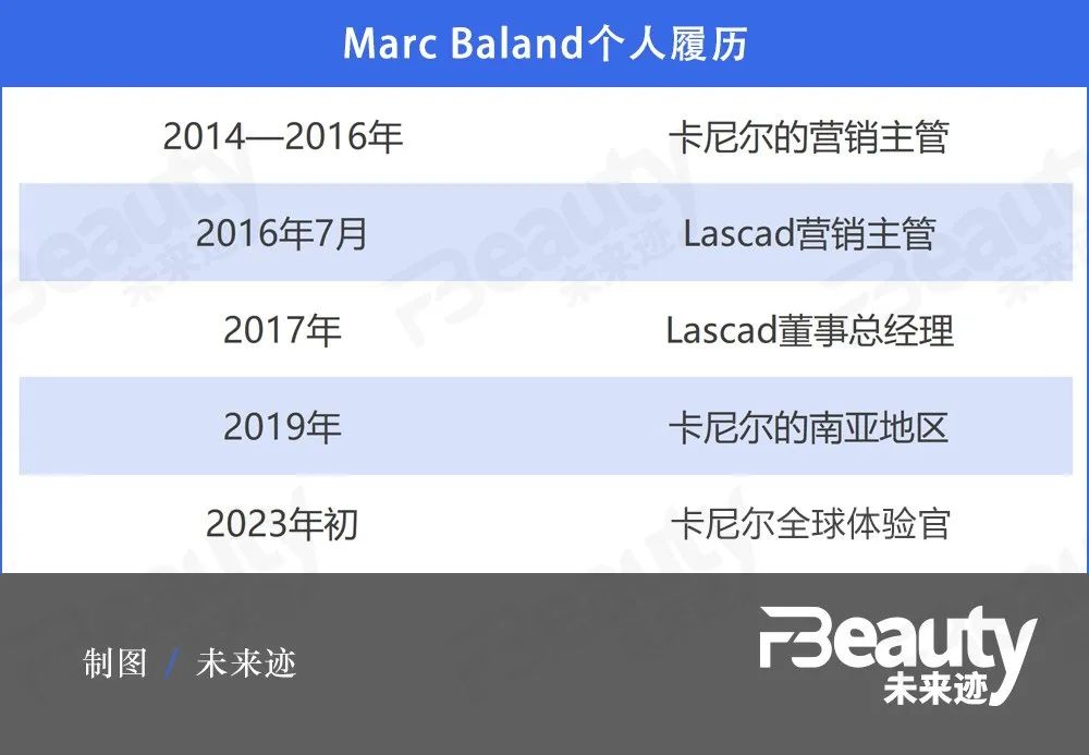 公開資料顯示,Marc Baland于2007年加入歐萊雅集團。在此之前,曾擔(dān)任耐克、Gap的商店經(jīng)理。2007年,Baland成為歐萊雅旗下大眾市場分銷公司Lascad的營銷項目經(jīng)理。其后他深度參與了卡尼爾營銷與品牌發(fā)展。
