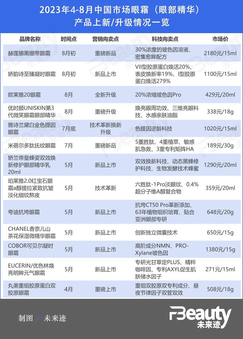 經(jīng)《FBeauty未來跡》不完全統(tǒng)計(jì),今年4月-8月較為集中的產(chǎn)品上新季,眼霜產(chǎn)品更新/推新品的知名品牌數(shù)量不少于13個(gè)。