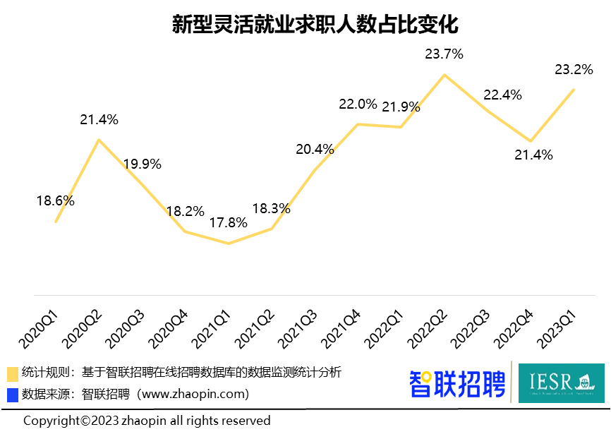 新型靈活就業(yè)在工資收入方面的優(yōu)勢(shì)愈發(fā)凸顯,招聘市場(chǎng)供需兩旺。數(shù)據(jù)顯示,在求職端,新型靈活就業(yè)求職者數(shù)量占比不斷提高,由2020年一季度的18.6%上升至2023年一季度的23.2%。