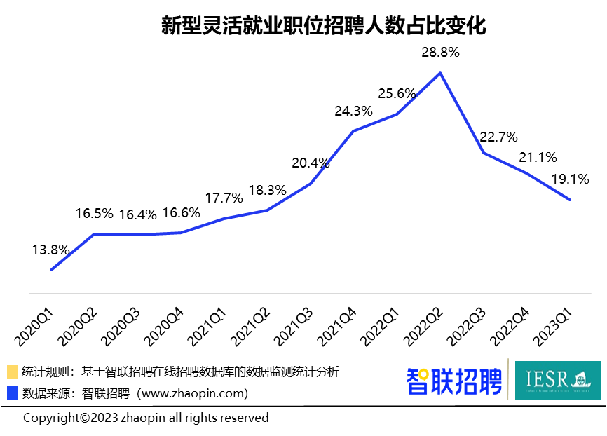 在招聘端,受益于數(shù)字經(jīng)濟(jì)的蓬勃發(fā)展,大量新型靈活就業(yè)崗位被釋放。2022年,我國(guó)數(shù)字經(jīng)濟(jì)占GDP比重已超過(guò)四成。報(bào)告數(shù)據(jù)顯示,今年第一季度,新型靈活就業(yè)招聘量占招聘總?cè)藬?shù)的比重為19.1%,較2020年初的13.8%有顯著提升。