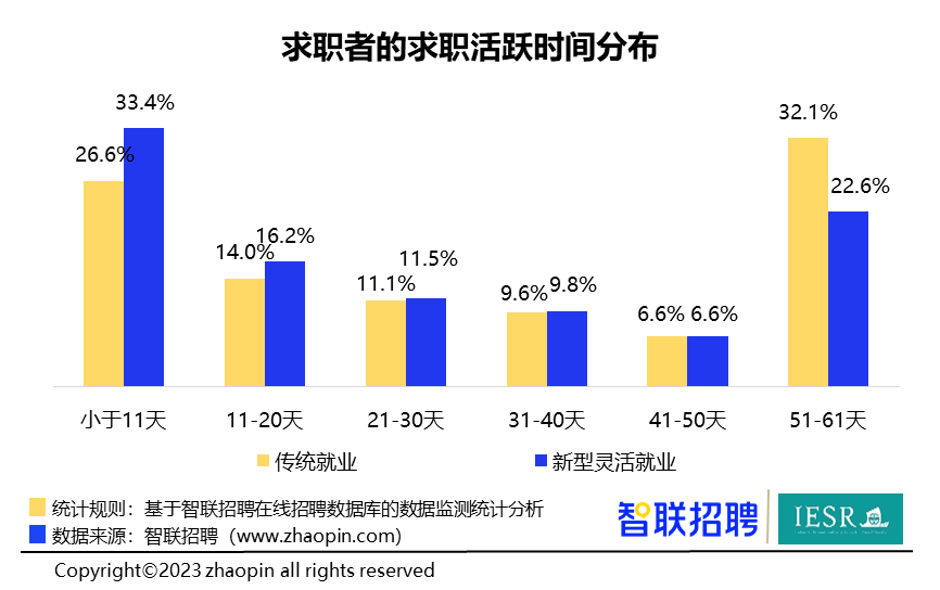 活躍的數(shù)字經(jīng)濟(jì)推動(dòng)新型靈活就業(yè)供需匹配,從業(yè)者可能更快找到工作。在招聘平臺(tái)上,這表現(xiàn)為求職者的活躍時(shí)間更短。據(jù)測(cè)算,近50%的新型靈活就業(yè)求職者可以在20天內(nèi)找到工作,比傳統(tǒng)就業(yè)求職者的這一比例(40.6%)高了9個(gè)百分點(diǎn)。