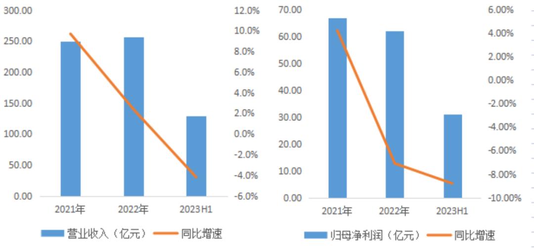 然而,2021年開始,海天味業(yè)的成長性和盈利能力都開始急轉直下。具體來看,2021-2022年海天味業(yè)的營收分別錄得250.0億元、256.1億元,同比增速9.7%、2.4%,為上市后公司營收增速首次降至個位數(shù)區(qū)間,不僅如此,2023年上半年,公司的營收增速更是降至了負增長區(qū)間,同比增速為-4.2%;雪上加霜的是,在成長性受挫的同時,公司的盈利能力也令人擔憂。2021-2023H1,公司的歸母凈利潤分別為66.7億元、62.0億元、31.0億元,同比增速為4.2%、-7.1%和-8.8%,利潤的降幅遠高于同期的營業(yè)收入。