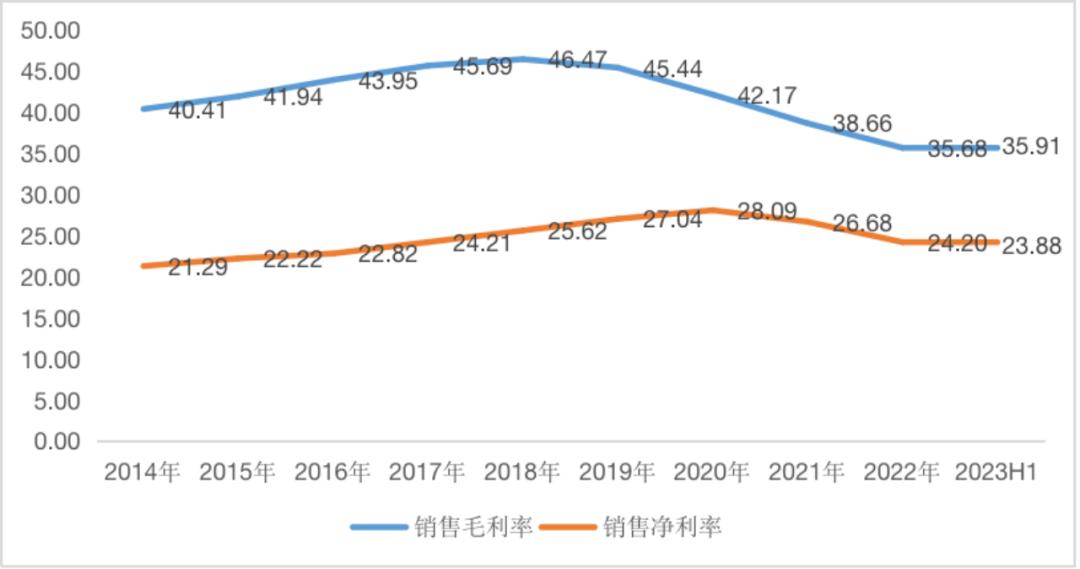 除了營收增速的下滑,海天味業(yè)基本面的風險還體現(xiàn)在近年來其盈利能力的下降。2020-2023H1,其歸母凈利潤的同比增速分別為19.6%、4.2%、-7.1%和-8.8%;同期歸母凈利率分別為28.1%、26.7%、24.2%和23.9%。
