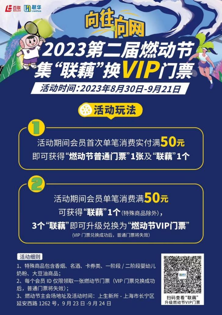 在上生新所的主會場活動中,消費者可以在藝術(shù)家市集和藝術(shù)大咖零距離互動,徜徉在藝術(shù)海洋,品味非遺木雕、手工掛件、香薰等藝術(shù)品;打卡網(wǎng)球?qū)^(qū),近距離欣賞上海勞力士大師賽冠軍獎杯與冠軍兵馬俑雕塑,感受世界對網(wǎng)球的熱愛;還有現(xiàn)場迷你游戲、精彩演出、AI互動和神秘大獎,驚喜連連,絕對是周末的休閑好去處。9月21日前,消費者前往世紀聯(lián)華及聯(lián)華超市直營門店,成為百聯(lián)通會員,首次單筆消費滿50元即可獲得燃動節(jié)普通門票1張,3個“聯(lián)藕”還可升級兌換為燃動節(jié)VIP門票,打卡現(xiàn)場活動,可獲得更多優(yōu)享權(quán)益及禮品。
