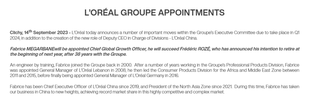 現(xiàn)任中國區(qū)“一把手”費(fèi)博瑞Fabrice Megarbane升任集團(tuán)首席增長官,接替要退休的Frédéric ROZé。據(jù)悉,為了確保順利過渡,費(fèi)博瑞Fabrice Megarbane將保留他目前的職責(zé),直到2024年1月底。