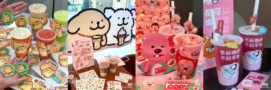 近幾年新紅起來的卡通形象,也是茶飲品牌喜歡合作的聯(lián)名對(duì)象,比如內(nèi)在小孩、小熊蟲、loopy、線條小狗、庫洛米。和前一類不同的是,這些卡通形象體現(xiàn)出一種潮流趨勢(shì),熱度及持續(xù)時(shí)間并不能打包票。但在IP初火時(shí)做出聯(lián)名,做好后續(xù)周邊,也很有可能可以小紅一把。