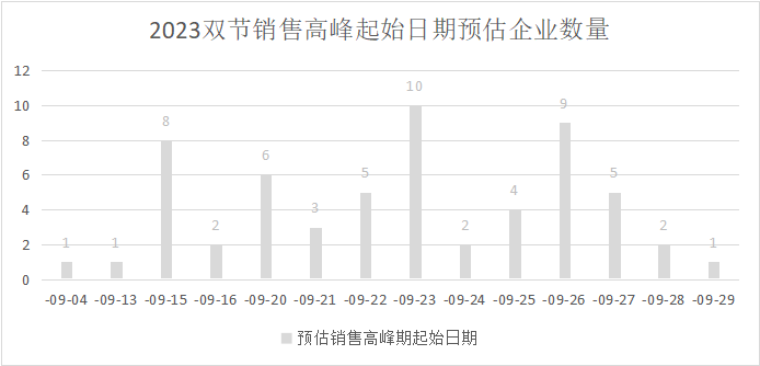 調(diào)查顯示,今年雙節(jié)合一,中秋、國慶兩個(gè)銷售節(jié)點(diǎn)合并,統(tǒng)計(jì)預(yù)估國內(nèi)銷售高峰期出現(xiàn)較為分散,最早9月4開始出現(xiàn)高峰,從9月8日到9月26日全國陸續(xù)進(jìn)入高峰,最晚9月29日出現(xiàn)。
