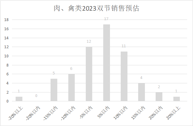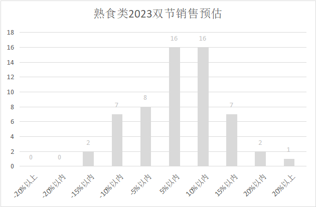 調(diào)查顯示:有42家企業(yè)預(yù)測銷售上漲(占比71%),17家企業(yè)預(yù)測銷售下跌(占比29%),預(yù)估銷售的中位數(shù)與眾數(shù)都為增長5%,平均值為4.58%。中秋和國慶節(jié)期間的家庭聚會,熟食同樣也是餐桌必備商品,增長幅度預(yù)測穩(wěn)中有升且較為趨同,影響預(yù)判減少的原因主要受人口流動,假期出行,餐飲業(yè)態(tài)回流等因素影響。