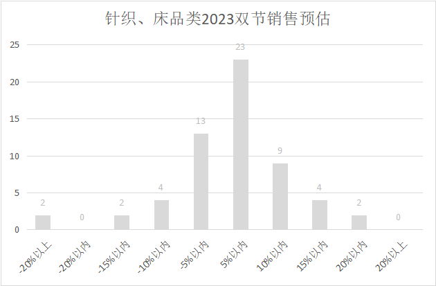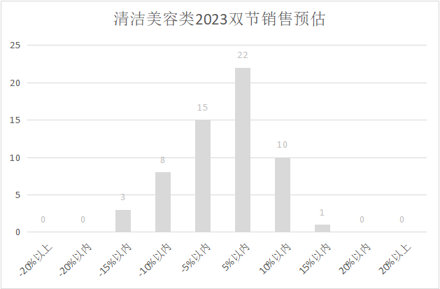 調(diào)查顯示:有33家企業(yè)預(yù)測銷售上漲(占比55%),26家企業(yè)預(yù)測銷售下跌(占比45%),預(yù)估銷售的中位數(shù)與眾數(shù)都為增長5%,平均值為0.32%。此類商品節(jié)日效應(yīng)較低。但美容類如防曬、保濕、驅(qū)蚊等功能性商品,針對性顧客出游場景引導(dǎo)應(yīng)該存在機(jī)會。