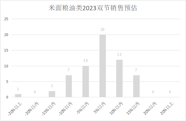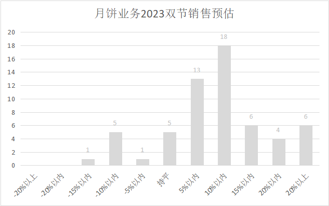 調(diào)查顯示:有39家企業(yè)預(yù)測銷售上漲(占比66%),20家企業(yè)預(yù)測銷售下跌(占比34%),預(yù)估銷售的中位數(shù)與眾數(shù)都為增長5%,平均值為2.54%。預(yù)測情況來看,半數(shù)企業(yè)預(yù)期銷售增長幅度較穩(wěn)定。節(jié)日送禮可能拉動部分增長,但不及春節(jié)假期。預(yù)判減少的原因主要與去年相比人口流動,購買頻次減少,假期出行,餐飲業(yè)態(tài)回流等因素影響。此外也與團(tuán)購業(yè)務(wù)的優(yōu)劣有直接關(guān)系。