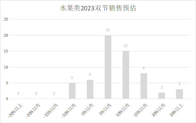 調(diào)查顯示:有48家企業(yè)預(yù)測銷售上漲(占比81%),11家企業(yè)預(yù)測銷售下跌(占比19%),預(yù)估銷售的中位數(shù)為增長5%,眾數(shù)為增長5%,平均值為6.89%。節(jié)日期間探親訪友的固定消費(fèi)需求、健康飲食的重視程度增強(qiáng),應(yīng)季水果的集中上市以及出行等因素將拉動水果銷售,尤其是禮盒裝水果或?qū)⒈憩F(xiàn)出色,穩(wěn)中有增的預(yù)期較為趨同。