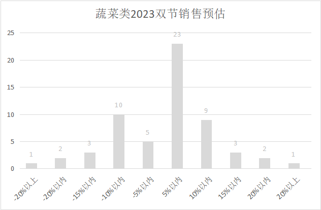 調(diào)查顯示:有45家企業(yè)預(yù)測銷售上漲(占比76%),14家企業(yè)預(yù)測銷售下跌(占比23%),預(yù)估銷售的中位數(shù)與眾數(shù)都為增長5%,平均值為5.59%。豆制品是餐桌必備食材,植物蛋白及健康概念,非節(jié)日期間也表現(xiàn)不俗。加之在家休息、假期陪伴的節(jié)日屬性,增長預(yù)期穩(wěn)定。