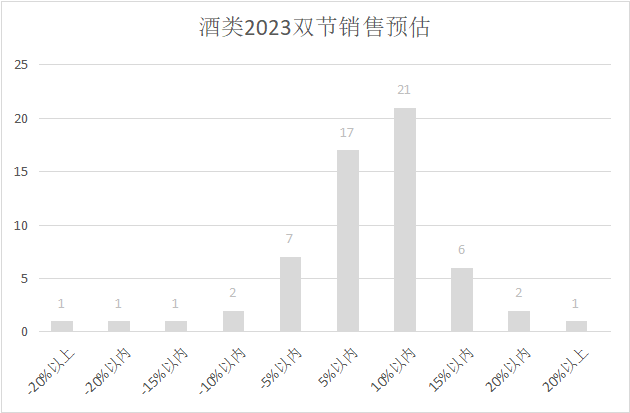 調(diào)查顯示:有47家企業(yè)預(yù)測銷售上漲(占比80%),12家企業(yè)預(yù)測銷售下跌(占比20%),預(yù)估銷售的中位數(shù)與眾數(shù)都為增長10%,平均值為6.89%。酒水節(jié)日屬性較強(qiáng),節(jié)假日必不可少,大部分對于5%-10%的增長幅度預(yù)期較為堅(jiān)決,部分企業(yè)或?qū)⒂懈咛嵘臻g。但需要注意的是,人口流動(出走、返鄉(xiāng))、高端酒低價(jià)酒之間的占比、超長假期帶來消費(fèi)時(shí)長或?qū)?shí)際銷售產(chǎn)生影響,也有企業(yè)反應(yīng),受不同購買渠道的酒類價(jià)格差異的影響,導(dǎo)致銷售預(yù)測較為悲觀。