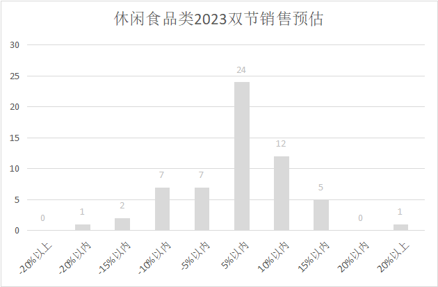 調(diào)查顯示:有42家企業(yè)預(yù)測銷售上漲(占比71%),17家企業(yè)預(yù)測銷售下跌(占比29%),預(yù)估銷售的中位數(shù)與眾數(shù)都為增長5%,平均值為3.14%。與方便食品趨同,節(jié)假日期間消費(fèi)者對休閑食品的需求會增加,具有強(qiáng)關(guān)聯(lián)性,具備增長條件。擔(dān)憂主要來源于新興零食業(yè)態(tài)的沖擊。