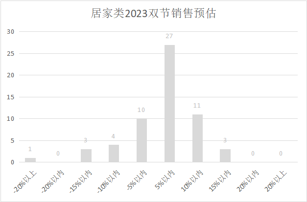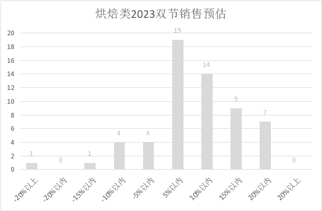 調(diào)查顯示:有43家企業(yè)預(yù)測銷售上漲(占比73%),16家企業(yè)預(yù)測銷售下跌(占比27%),預(yù)估銷售的中位數(shù)與眾數(shù)都為增長5%,平均值為3.64%。預(yù)判趨勢較為穩(wěn)定,但與往年相比,在家時(shí)間減少,外出人口流動增加或?qū)︿N售產(chǎn)生影響。