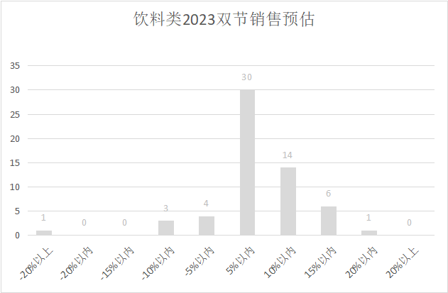 調(diào)查顯示:有51家企業(yè)預(yù)測銷售上漲(占比86%),8家企業(yè)預(yù)測銷售下跌(占比14%),預(yù)估銷售的中位數(shù)及眾數(shù)為增長5%,平均值5.51%。在出游需求、節(jié)慶送禮、餐桌必備等多消費(fèi)場景激發(fā)下,飲料穩(wěn)中有增預(yù)判較為趨同。