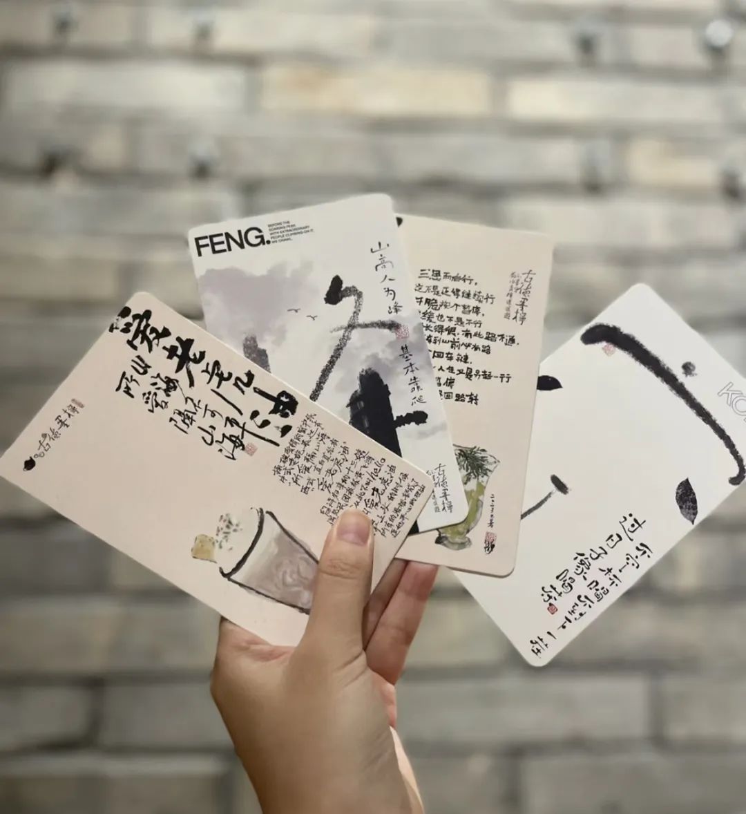 包括門店新開業(yè)的明信片、杯套、作品卡,都是融入了詩(shī)詞、中國(guó)水墨畫等文學(xué)元素。