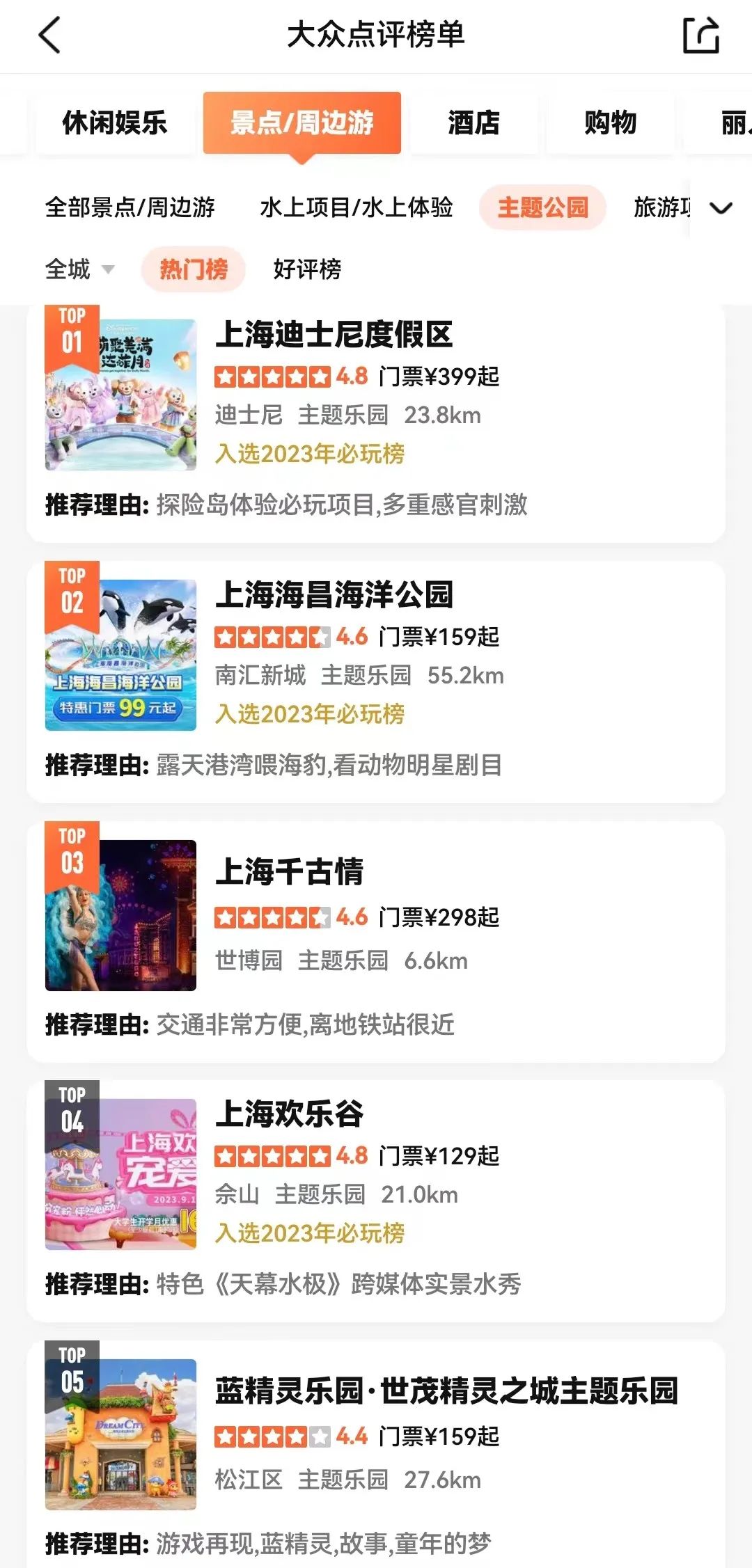 以下為上海主題公園大眾點評最新熱門榜TOP5