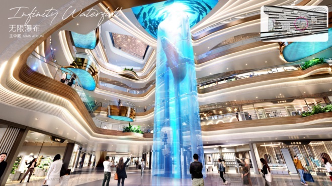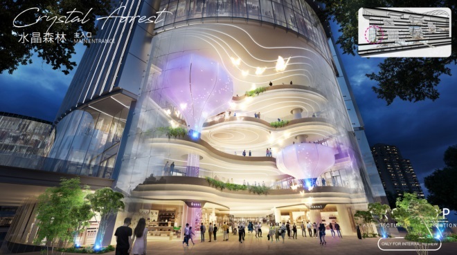 1層至5層局部挑高設(shè)計(jì),獨(dú)特的場(chǎng)景化設(shè)計(jì)增強(qiáng)入口的到達(dá)感及室內(nèi)外的連接。水晶森林,將自然環(huán)境帶入室內(nèi),如置身于山林之中。無(wú)限瀑布,利用25米高的觀光電梯,配合LED投影流水影像,視覺(jué)上形成飛瀑的效果。