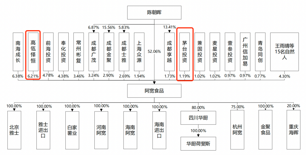 截至招股書(shū)簽署之日,高瓴懌恒持有阿寬食品6.21%的股份;茅臺(tái)投資持有公司1.19%的股份。