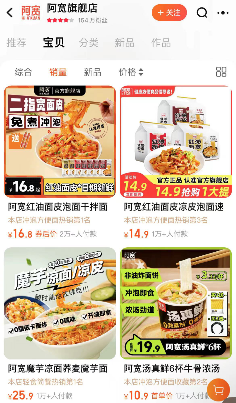 以紅油面皮為主的方便面食品,占據(jù)了阿寬食品銷售金額的半壁江山。目前,淘寶阿寬旗艦店中,銷量前兩名的產(chǎn)品均是紅油面皮。