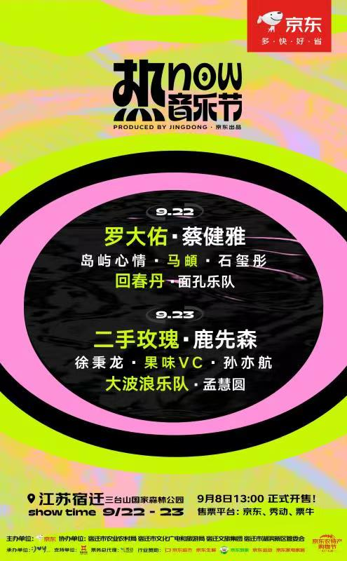 9月22日至23日,由京東主辦、宿遷市農(nóng)業(yè)農(nóng)村局、宿遷市文化廣電和旅游局、宿遷文旅集團(tuán)、宿遷市湖濱新區(qū)管委會(huì)協(xié)辦的首屆“熱NOW音樂節(jié)”,將于宿遷市三臺(tái)山國家森林公園舉行。