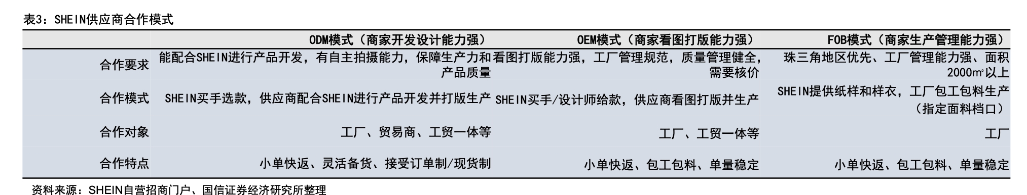 供應(yīng)體系方面,SHEIN建立起小單快返的柔性供應(yīng)鏈體系,為成衣供應(yīng)商提供了ODM、OEM、 FOB三種不同的合作模式,整合了上游大量工廠的生產(chǎn)力,構(gòu)建起了多層次、動(dòng)態(tài)的供應(yīng)商合作體系,