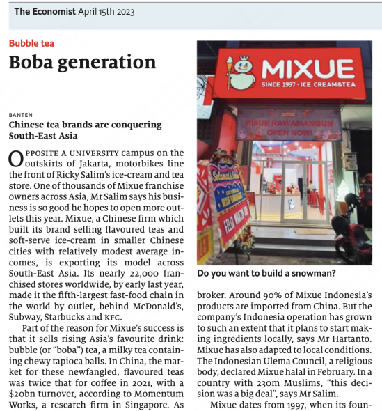 東南亞市場是眾多新茶飲品牌出海的第一站,也成為當(dāng)?shù)叵M(fèi)市場一道靚麗的風(fēng)景線。《經(jīng)濟(jì)學(xué)人》雜志報(bào)道中展示了在印度尼西亞各地的購物中心、大街小巷以及大大小小的商店中,隨處可見蜜雪冰城的亮紅色標(biāo)志和雪人標(biāo)志。周末,蜜雪冰城門店里往往擠滿了帶孩子去吃冰淇淋的家長。而在工作日,蜜雪冰城的顧客主要是學(xué)生和上班族。蜜雪冰城既能夠給他們提供物美價(jià)廉的冰淇淋,也能讓他們尋到一處舒適的工作場所。