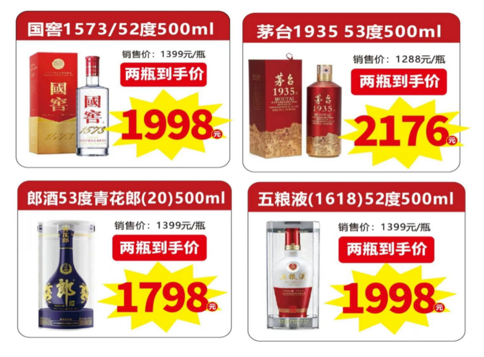 從華潤萬家員工處得知,至9月24日持續(xù)優(yōu)惠價出售高端名品白酒,五糧液、茅臺、國窖1573、青花郎4大國內(nèi)高端名白酒代表,成雙成對,送禮不出錯。無論送老丈人、送領導、送親朋好友,都是拿得出手的不二選擇,高端大氣、囤貨首選。同樣適合自留小酌、擺柜收藏,成對購買更劃算。
