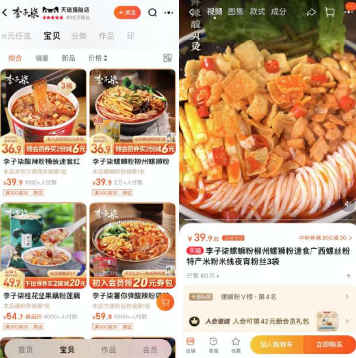 包括臭寶的淘寶旗艦店,雖然粉絲量只有71.8萬,不及李子柒旗艦店的600萬體量,但臭寶螺螄粉39.9元單品月銷量就達(dá)到4萬+,目前為止已售出70萬。