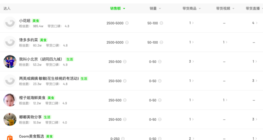 他們傾向于合作生活類主播或美食主播,例如@小貝餓了、@彩虹夫婦、@郝劭文等。