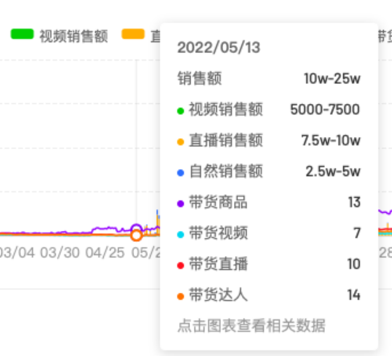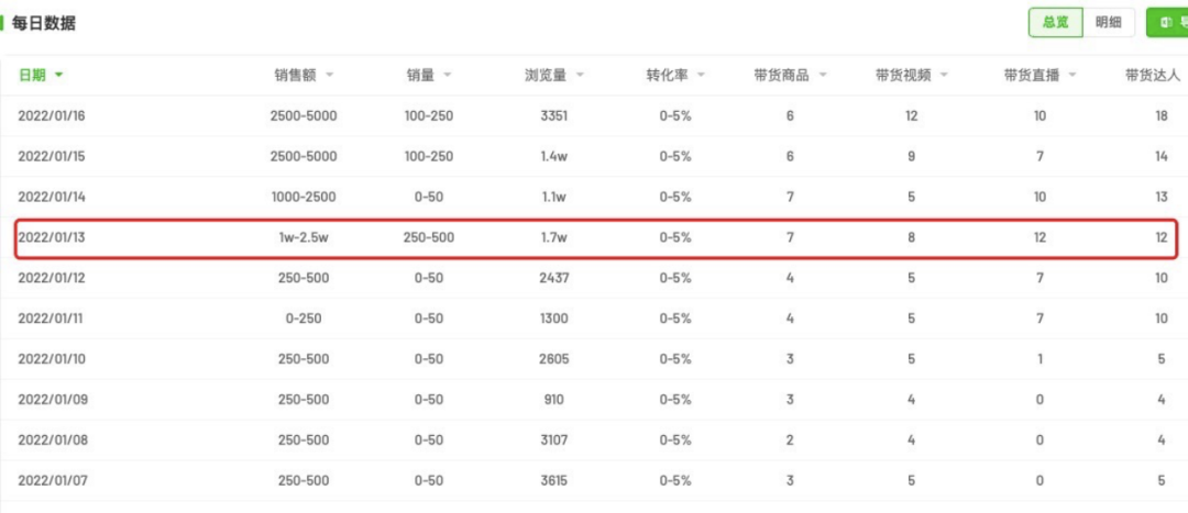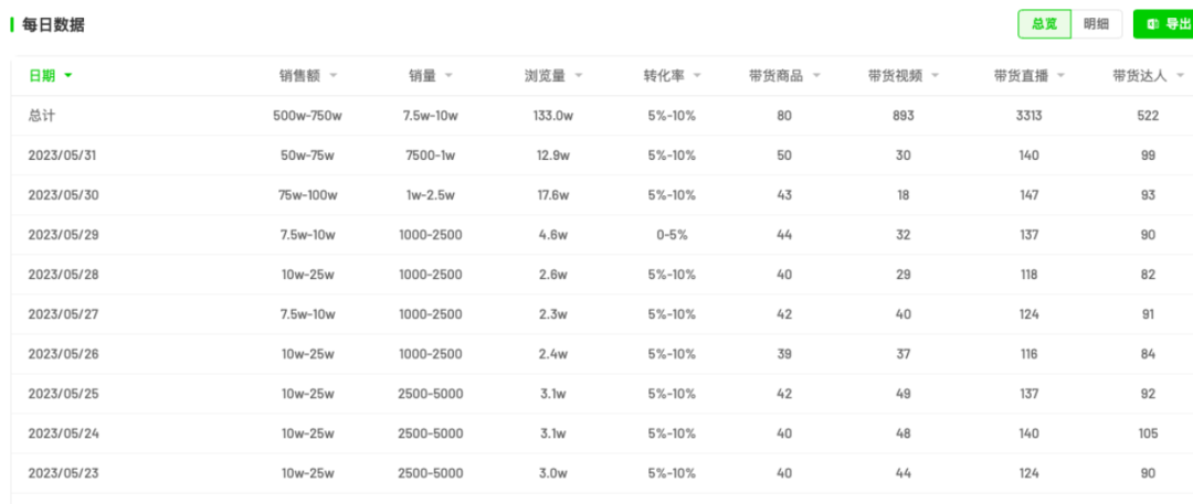 例如在5月13日,微念投放了14個達(dá)人,當(dāng)日的銷售額就達(dá)到了10萬-25萬,其中包括7.5萬-10萬的直播銷售額,還有2.5萬-5萬的自然銷售額。